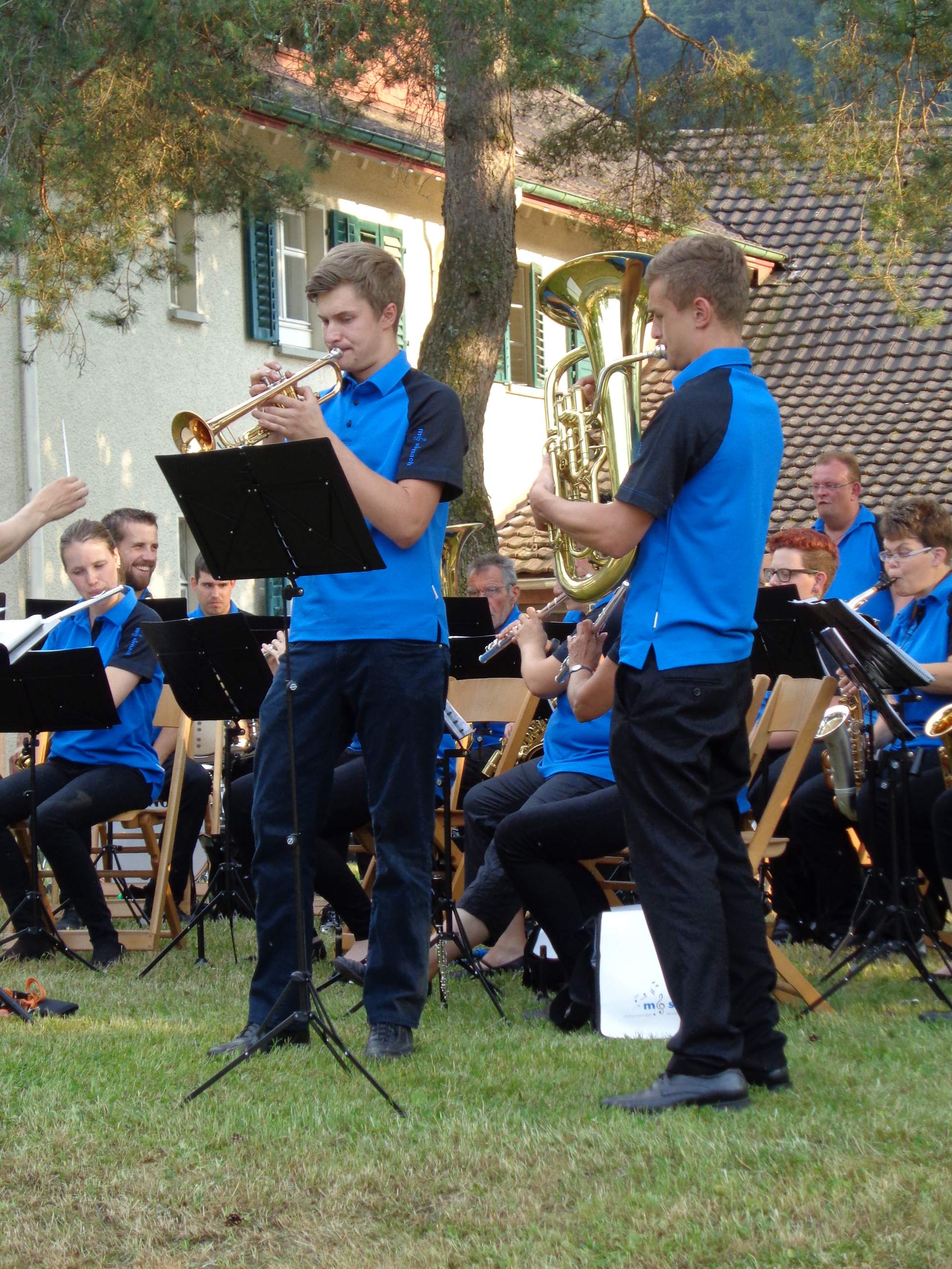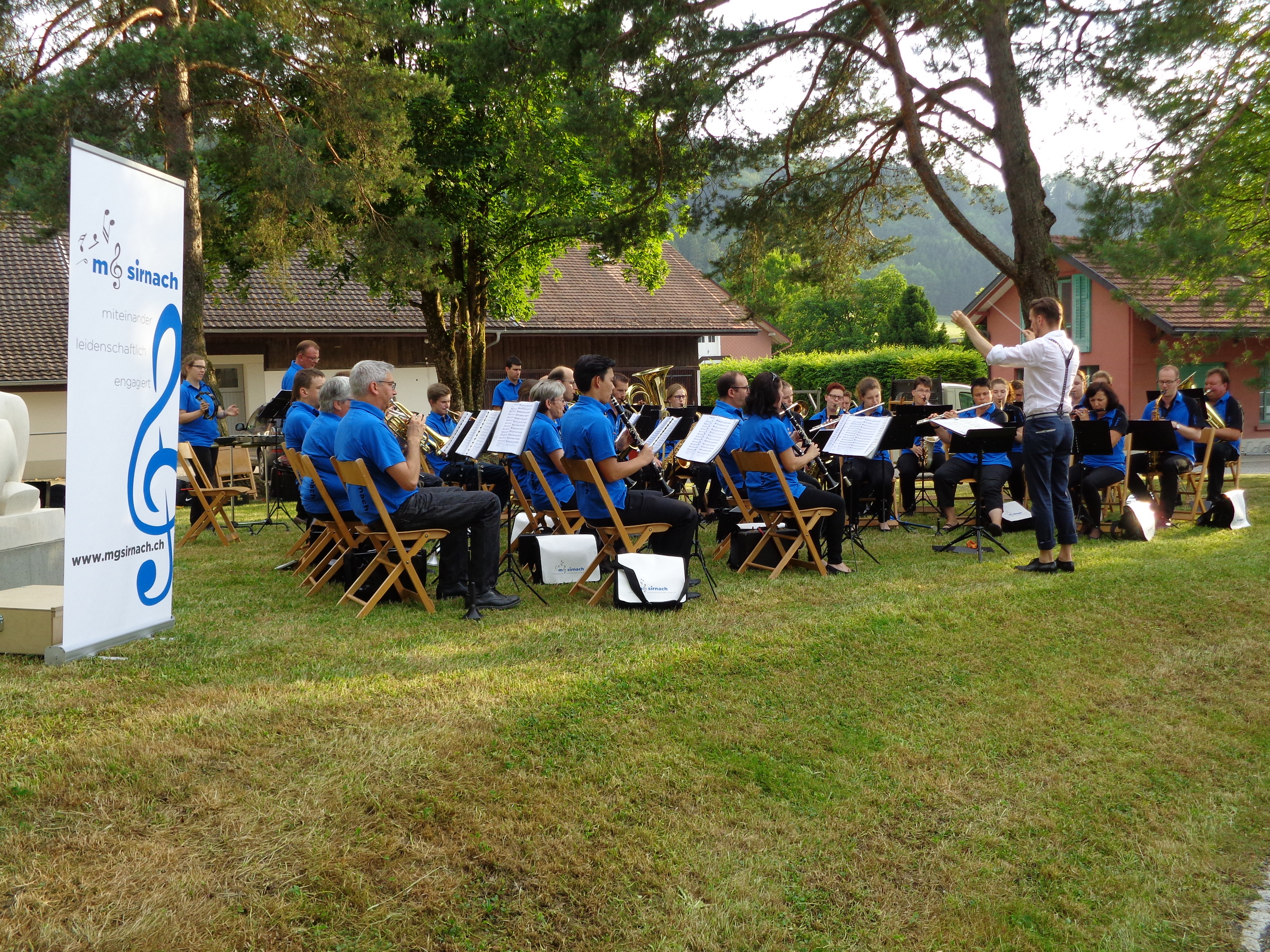 Gespielt wurde auf der Terrasse des Cafés. Ein Glück, dass die Musikantinnen und Musikanten nicht nur eine neue Uniform, sondern auch ein bequemes T-Shirt für sommerlich-warme Anlässe bekommen haben. Das bunte Repertoire mit bekannten Melodien wie „Bon Jovi - Rock Mix“ oder „2er-Polka“ kam bei den Besuchern sehr gut an. Der Applaus am Schluss war riesig, eine Zugabe durfte definitiv nicht fehlen. Mit „Over and out“ ging dann ein gelungenes Sommerkonzert zu Ende.