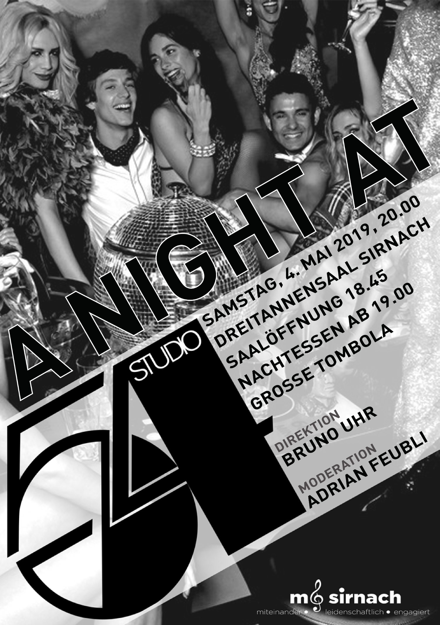 Am Samstag, 4.Mai 2019 um 20:00 Uhr lädt die Musikgesellschaft Sirnach zum diesjährigen Unterhaltungsabend unter dem Motto „ A night at Studio 54“ in den Dreitannensaal. Unter der Leitung von Bruno Uhr und mit dem Moderator Adrian Feubli wird die Musikgesellschaft Sirnach die schrille Welt des Studio 54 und der wilden 70er Jahre für einen Abend nochmals aufleben lassen.