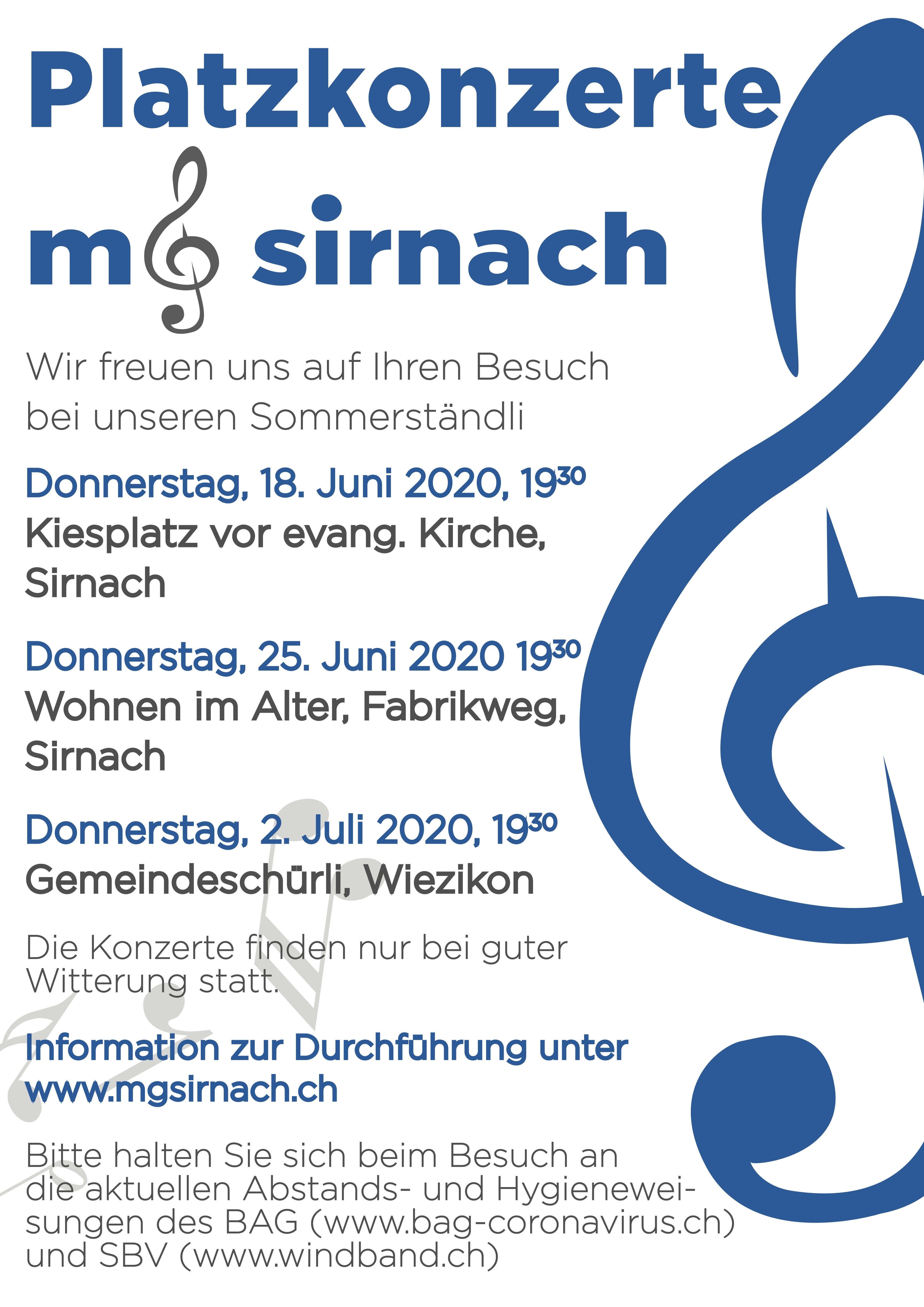 Bei hoffentlich schönem Sommerwetter musizieren wir während den nächsten drei Donnerstagen abends jeweils ab 19:30 Uhr für Sie in Sirnach und Wiezikon.