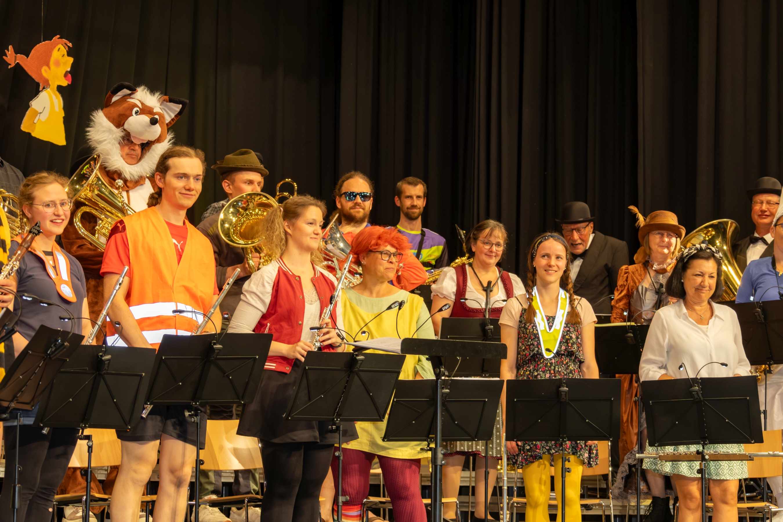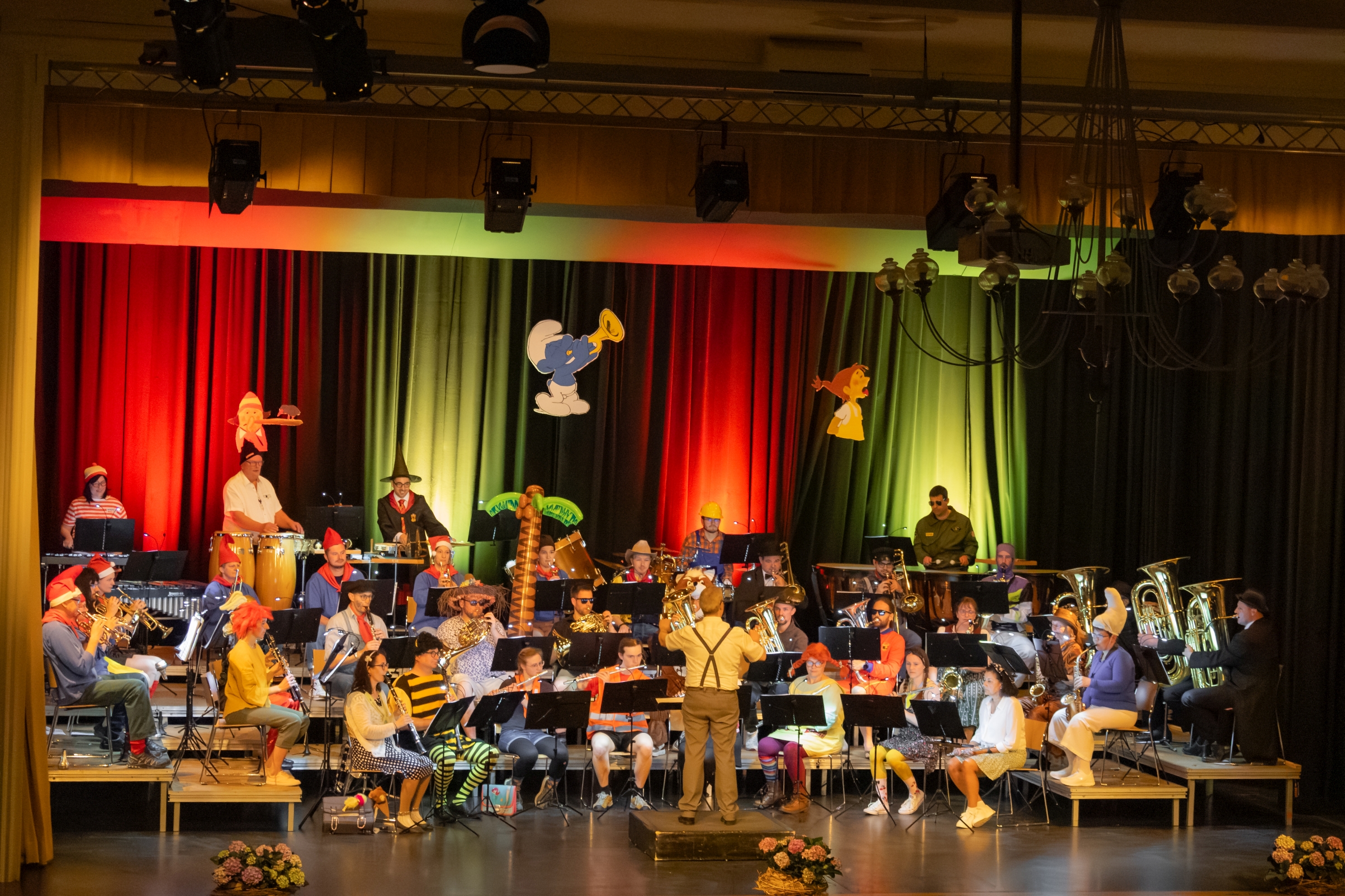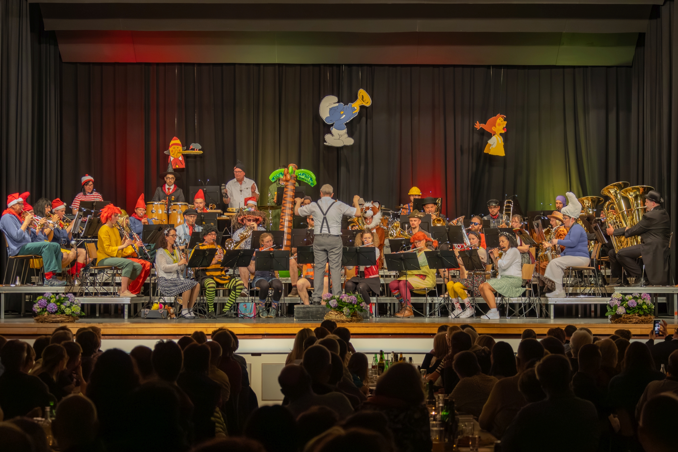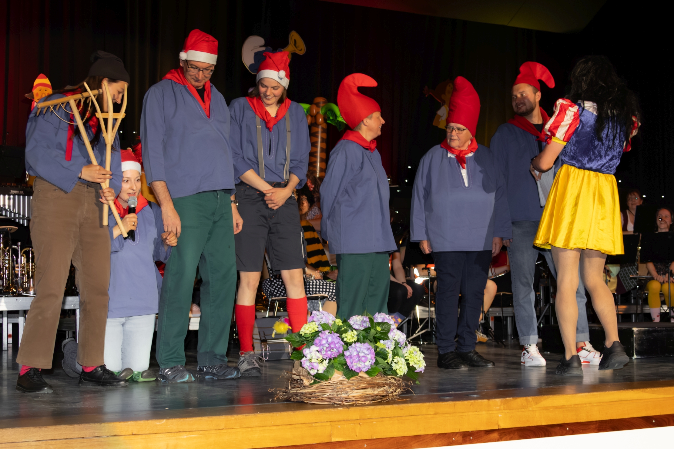 Nach der Pause erschienen die Musikantinnen und Musikanten kunterbunt gekleidet durch den Saal auf der Bühne und eröffneten den zweiten Konzertteil mit Bonanza. Für Lacher sorgte "Schneewittchen" Marco mit den sieben Zwergen. Das Stück Hurra Hurra, einem Medley mit Liedern aus bekannten Kinderfilmen wie Pippi Langstrumpf, die Schlümpfe oder Pumuckl, löste beim Publikum grosse Begeisterung aus. Zum Abschluss des zweiten Teils wurde What a Feeling von "Flashdance" gespielt.