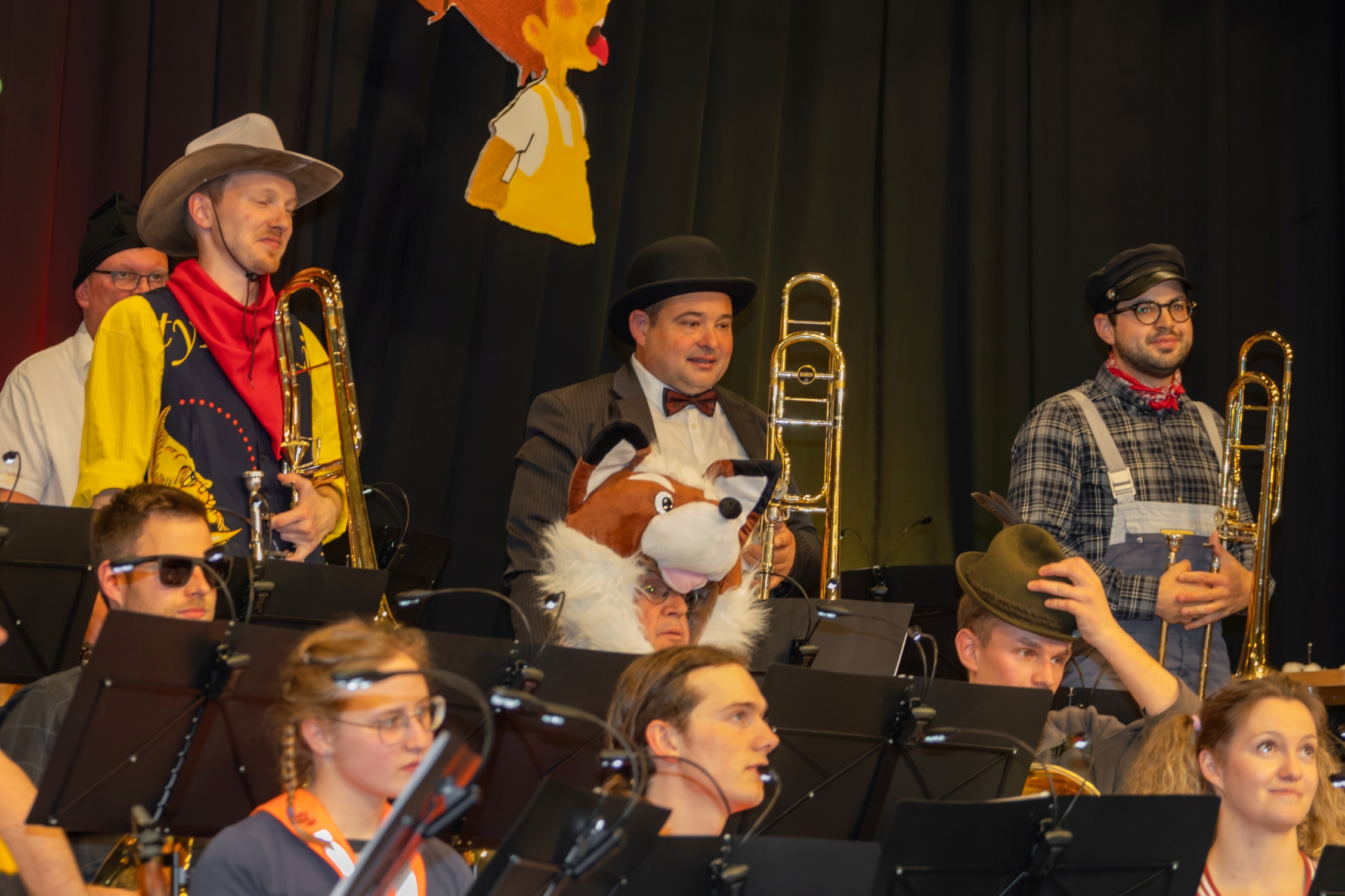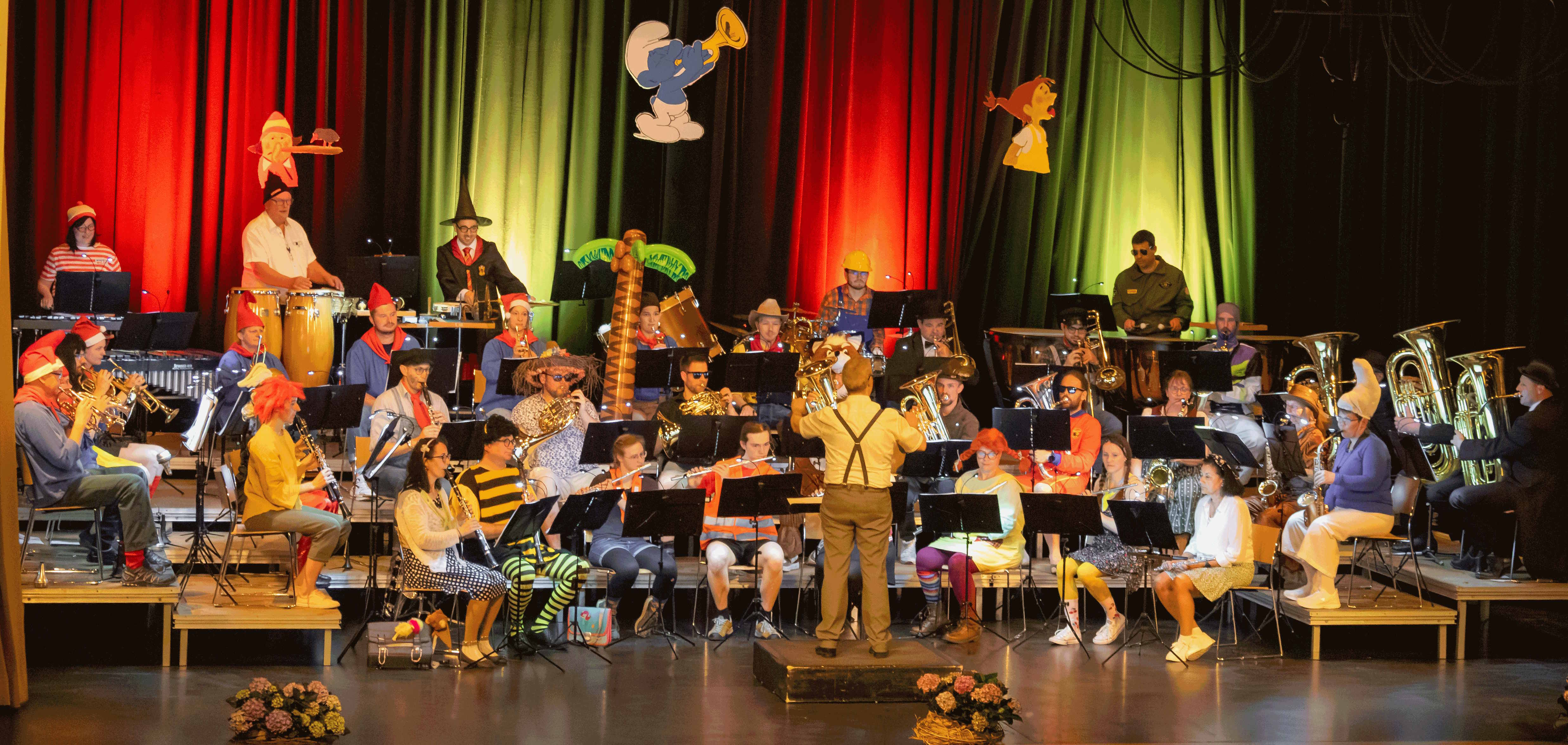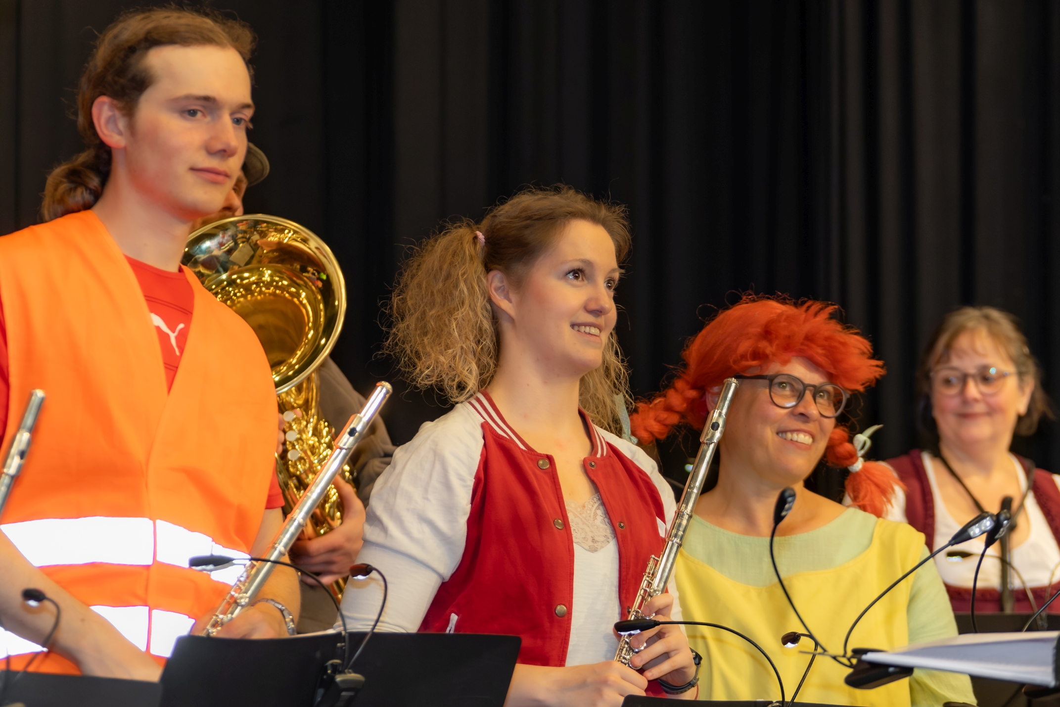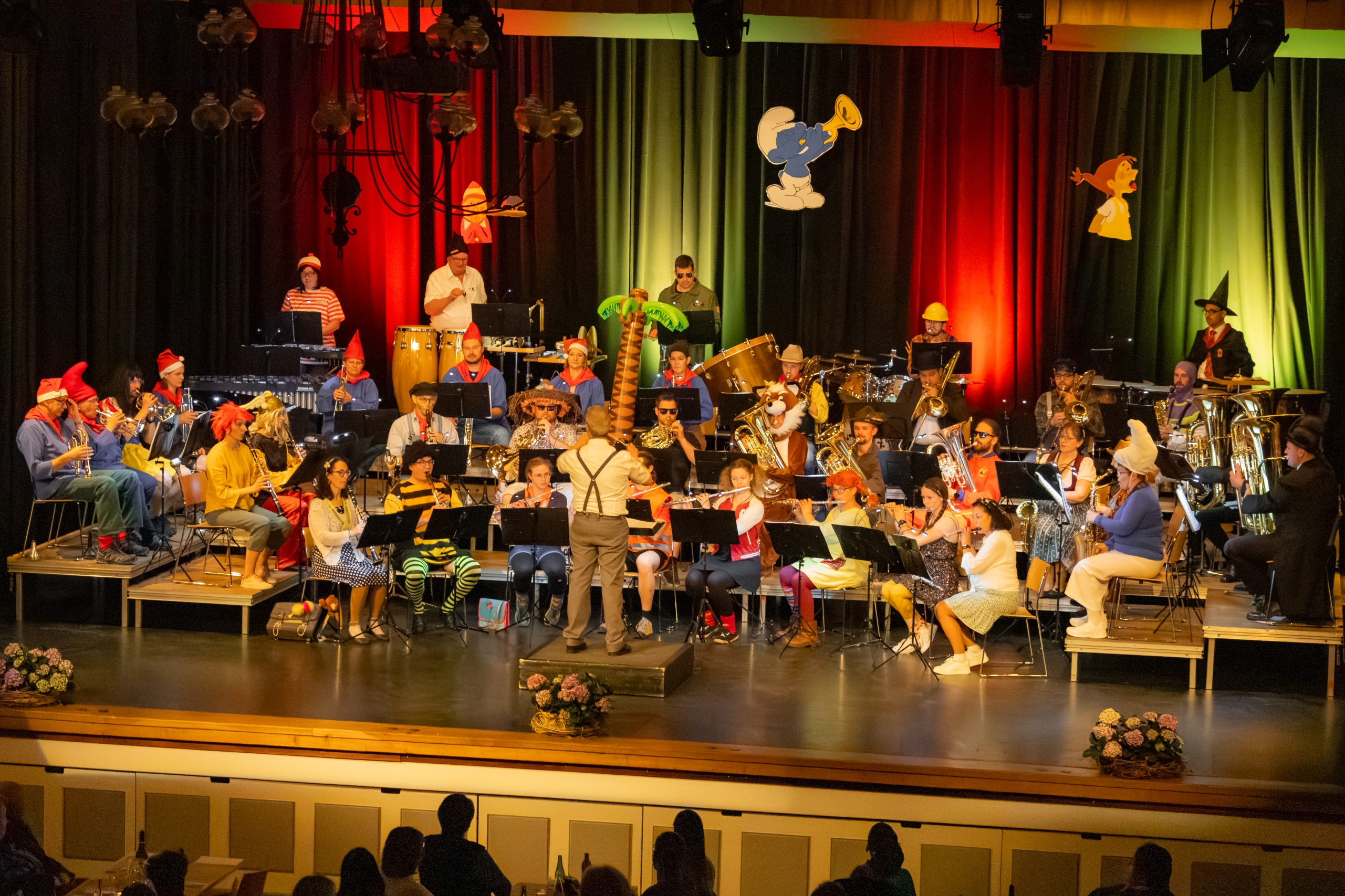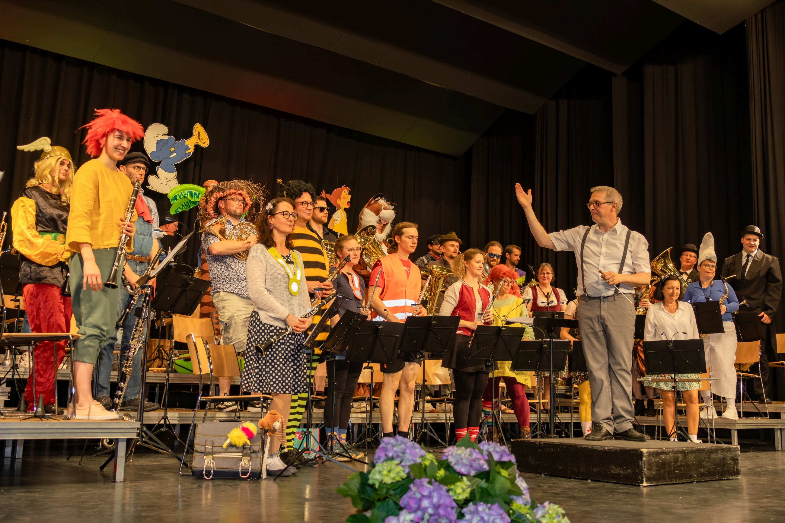 Nach der Pause erschienen die Musikantinnen und Musikanten kunterbunt gekleidet durch den Saal auf der Bühne und eröffneten den zweiten Konzertteil mit Bonanza. Für Lacher sorgte "Schneewittchen" Marco mit den sieben Zwergen. Das Stück Hurra Hurra, einem Medley mit Liedern aus bekannten Kinderfilmen wie Pippi Langstrumpf, die Schlümpfe oder Pumuckl, löste beim Publikum grosse Begeisterung aus. Zum Abschluss des zweiten Teils wurde What a Feeling von "Flashdance" gespielt.