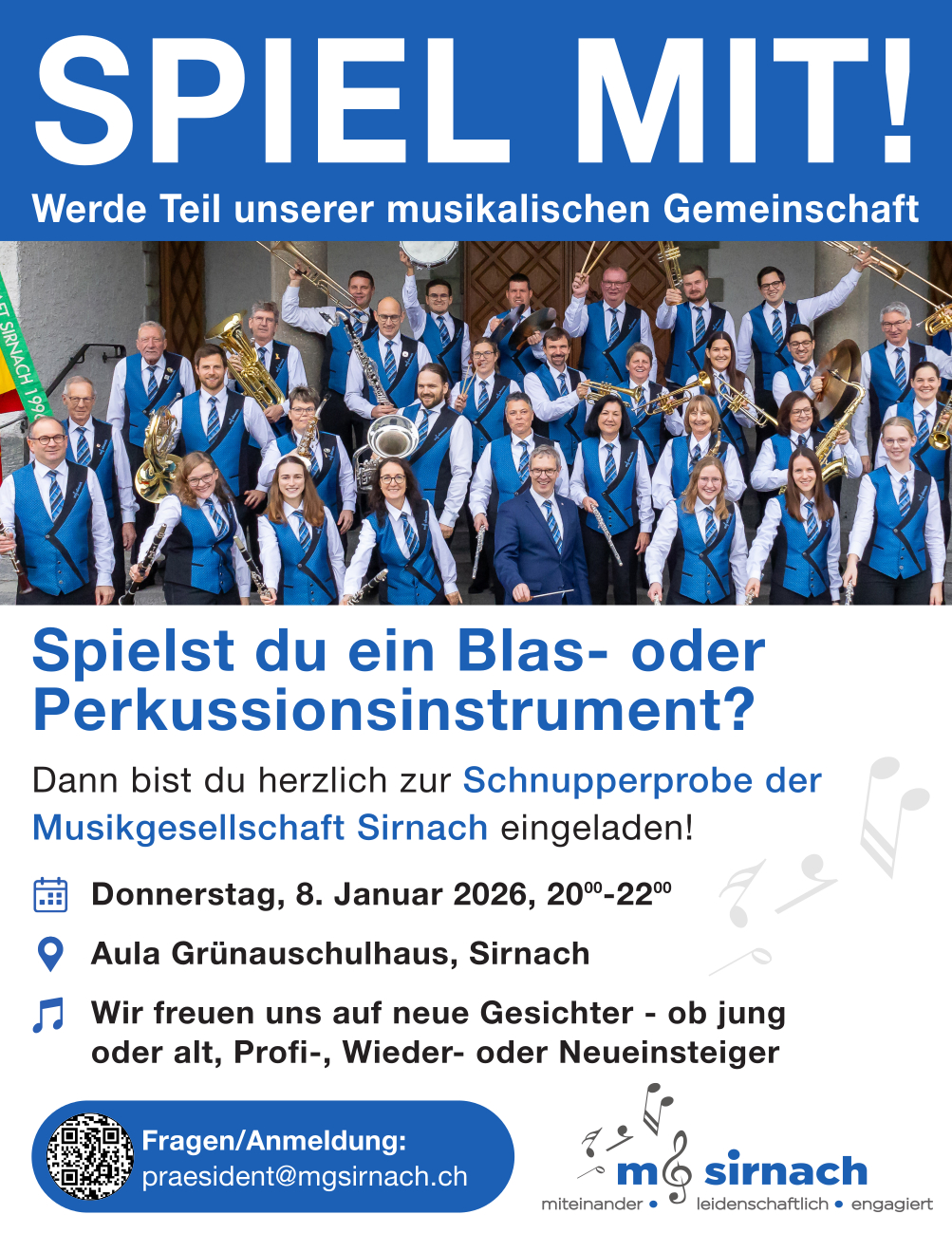 Weitere Informationen und Bedingungen zum Angebot entnehmen Sie bitte dem Anmeldeformular. Bei Fragen betreffend der Nachwuchsausbildung und der Jugendmusik Sirnach/Münchwilen melden Sie sich bitte bei Stefan Rietmann, Obmann der Jugendmusik der MG Sirnach.